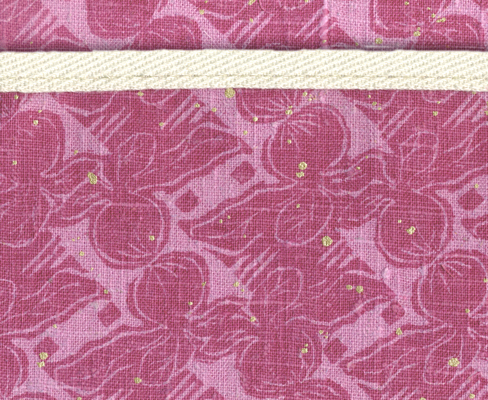 A natural, nubby weave of hemp and cotton with an overall stylized radish print the colors of raspberry sherbet. Gold toned spatter dots. Natural handles and edging. Solid brass rings.